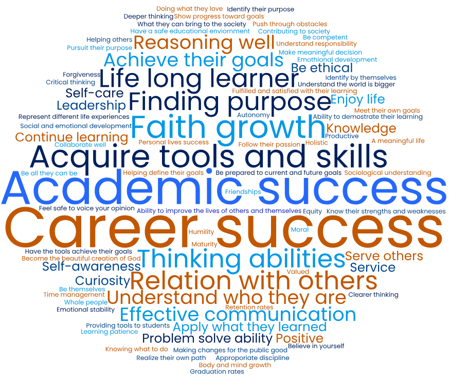 The HERI Faculty Survey is a triennial national survey offered through UCLA’s Higher Education Research Institute (HERI). All Pepperdine faculty are invited to participate in the survey. The survey provides information on pedagogical practices, faculty goals and expectations, research and service activities, sources of stress and satisfaction, and the connection between learning in the classroom and practices in the local and global community. Participants were also asked to describe “student success” in their own words, and the word cloud here displays the key words from Pepperdine faculty replies to the HERI 2023 survey.